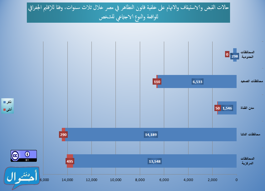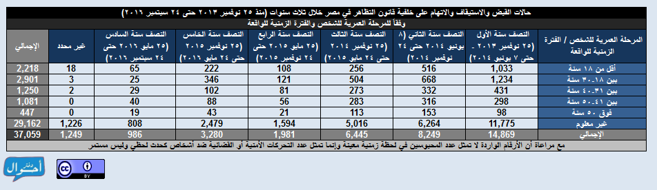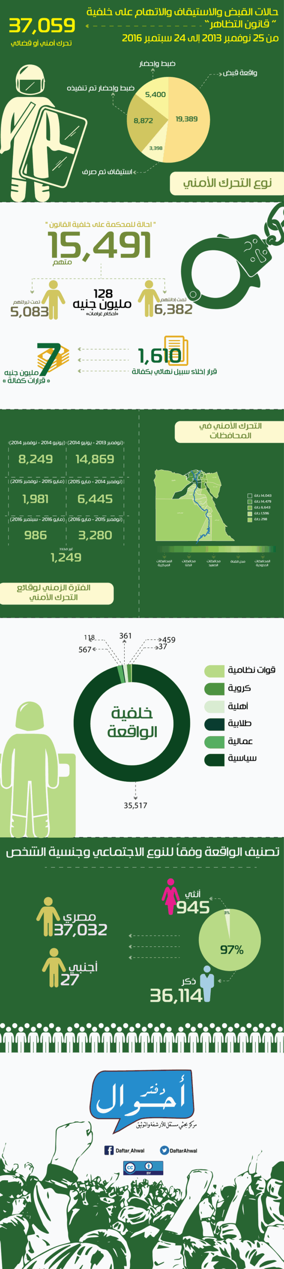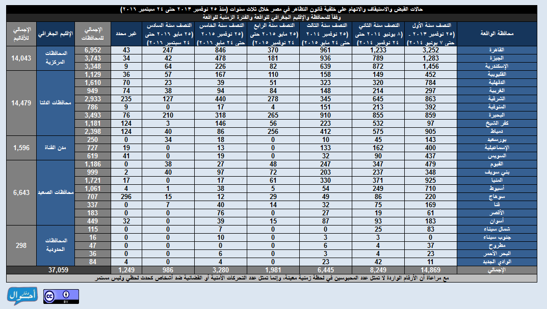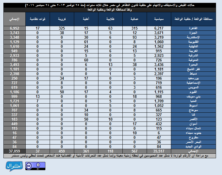 عقب تطبيق قانون 107 لسنة 2013 المعروف إعلاميا باسم “قانون التظاهر”، وفي خلال الفترة بين (25 نوفمبر 2013 حتى 24 سبتمبر 2016) تم تسجيل وأرشفة ما يزيد عن 37 ألف (37.059) حالة تحرك أمني أو قضائي ضد أشخاص (سواء تم ضبطهم أو مطلوبين ضبط وإحضار) على خلفية تطبيق القانون في جميع محافظات الجمهورية، وذلك عبر 301 دائرة قسم شرطة مختلفة، بينهم 19.389 حالة “قبض” وإحالة للنيابة و 3.398 حالة “استيقاف ثم صرف” فيما بعد دون تحرير محضر و 8.872 حالة “ضبط وإحضار تم تنفيذه” بالقبض على الشخص المطلوب وإحالته للنيابة و 5.400 قرار “ضبط وإحضار” لأشخاص غير معلوم تم تنفيذه أم لا، وبلغت عدد الحالات 37.059 حالة من الذكور والإناث، من ضمنهم 14.869 حالة في النصف الأول من العام المحدد (25 نوفمبر 2013 حتى 7 يونيو 2014)، وذلك وفقا للمصادر الرئيسية لاعتماد الوقائع وهي أوراق القضايا، مصادر رسمية، جهات حقوقية، ووسائل الإعلام، وقد نالت وسائل الإعلام الرئيسية النصيب الأوفر في اعتماد الوقائع بعدد 23.438 واقعة.