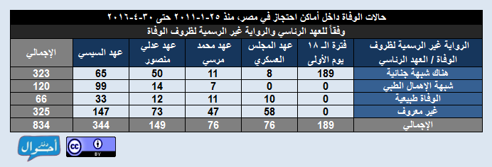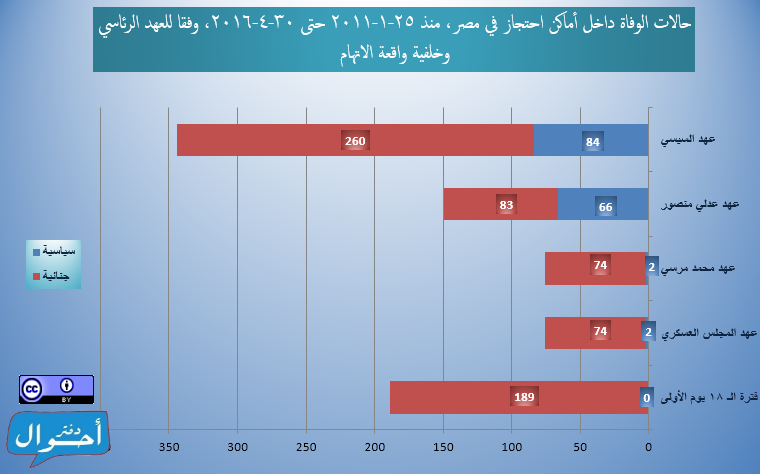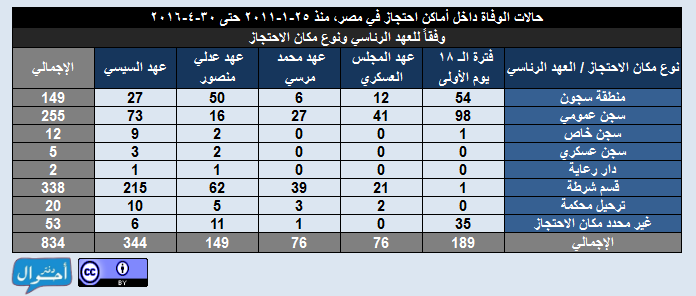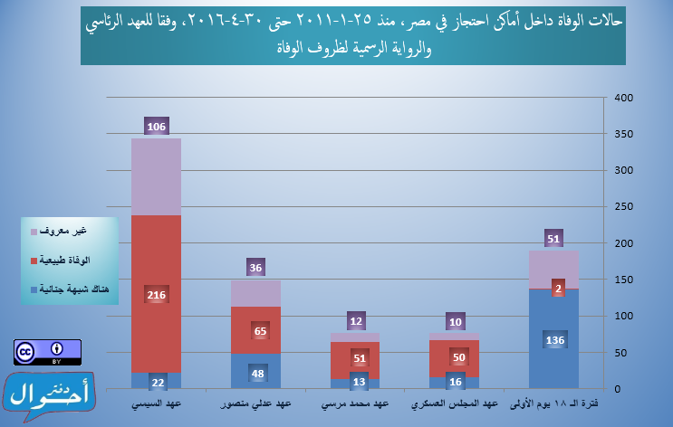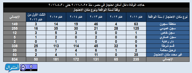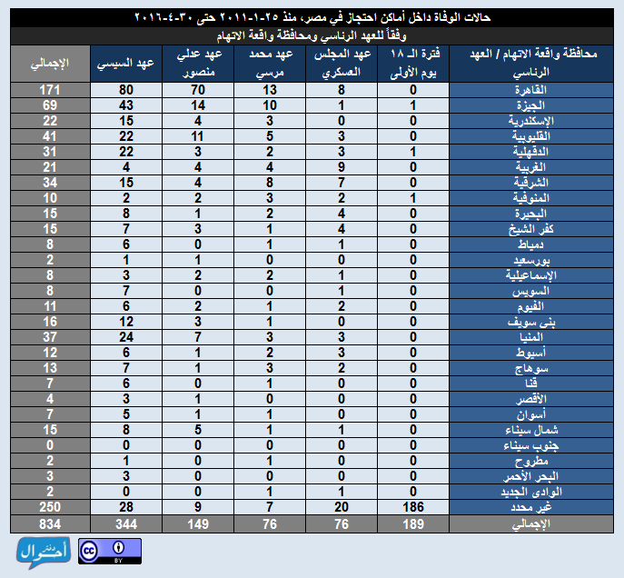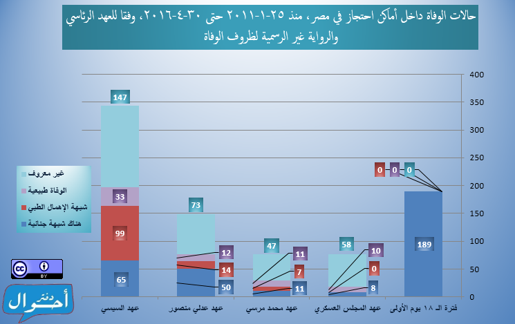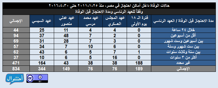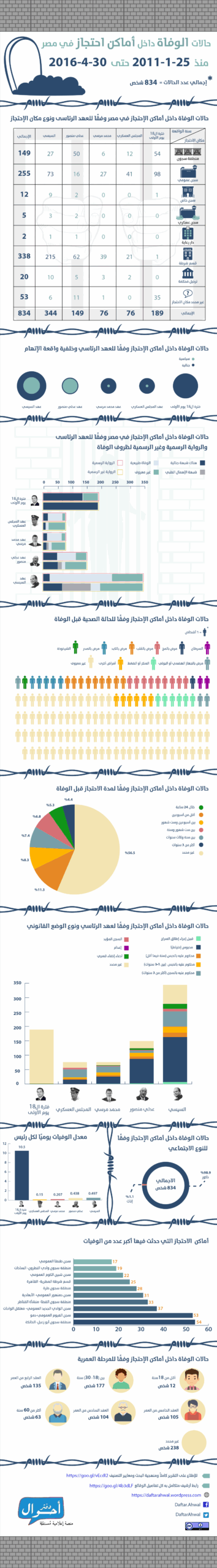 بعد قرابة خمس سنوات ونصف منذ ثورة 25 يناير، في الفترة من ( 25 يناير2011 حتى 30 أبريل 2016)، تم تسجيل وأرشفة 834 حالات وفاة داخل أماكن احتجاز في مصر، موزعين عبر 204 مكان احتجاز مختلف في 27 محافظة تقريبا، وذلك بمعدل يقترب من حالة وفاة كل يومين، وذلك في عهود خمس رئاسية منذ ايام الثورة الأولى وحتى عهد السيسي في إبريل 2016، وقد تم احتساب معدل الوفيات يوميا لكل رئيس بقسمة إجمالي عدد الوفيات خلال العهد الرئاسي على عدد أيام المدة الرئاسية.