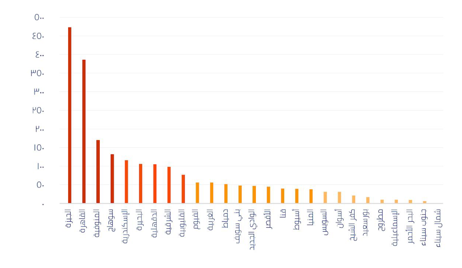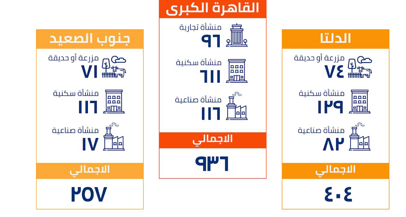 عرض المرصد مسارا إحصائيًًا لعدد الوحدات المتضررة بالتوزيع على الأقاليم ، شهد إقليم القاهرة الكبرى العدد الأكبر من المنشآت المتضررة بواقع 1015 وحدة، يليه إقليم الدلتا بإجمالي 459 وحدة، فيما شهد إقليم وسط الصعيد العدد الأقل بإجمالي 122 وحدة، يليه إقليم القناة بإجمالي 176 وحدة متضررة.