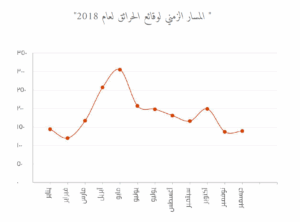 أوضح المسار الزمني لوقائع الحرائق لعام 2018، أن شهر مايو شهد العدد الأكبر من الوقائع بإجمالي 305 واقعة، يليه شهر أبريل بإجمالي 257 ، ثم شهر يونيو بإجمالي 207 واقعة. بينما شهد شهر نوفمبر 137 واقعة يليه شهر ديسمبر بإجمالي 139 واقعة، فيما شهد شهر فبراير العدد الأقل بإجمالي 120 واقعة.