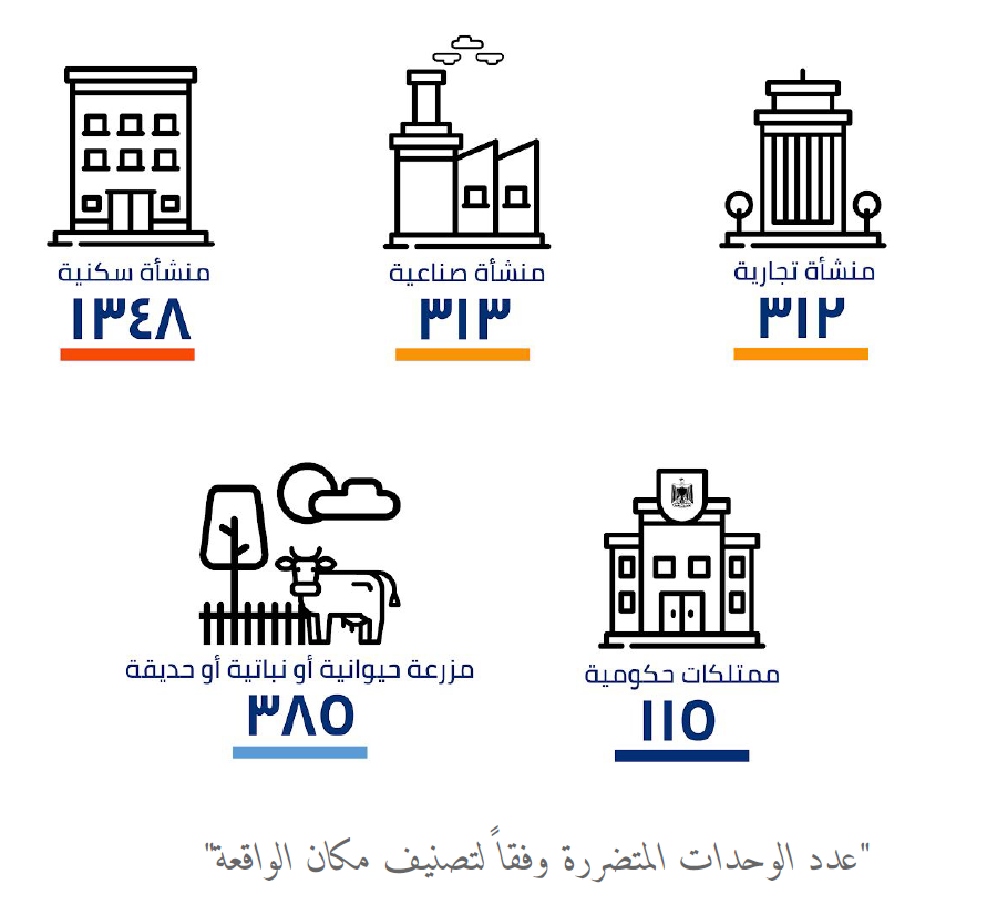 بالنسبة لعدد الوحدات المتضررة وفقا لتصنيف مكان الواقعة، بلغ تصنيف “منشأة سكنية” العدد الأكبر بإجمالي 1348 وحدة متضررة، يليه تصنيف “مزرعة حيوانية أو نباتية أو حديقة” بإجمالي 385 وحدة متضررة، فيما بلغ تصنيف “منشأة خيرية” العدد اﻷقل بإجمالي 4 وحدات متضررة، يليه تصنيف “ممتلكات عامة” بإجمالي 9 وحدات متضررة.