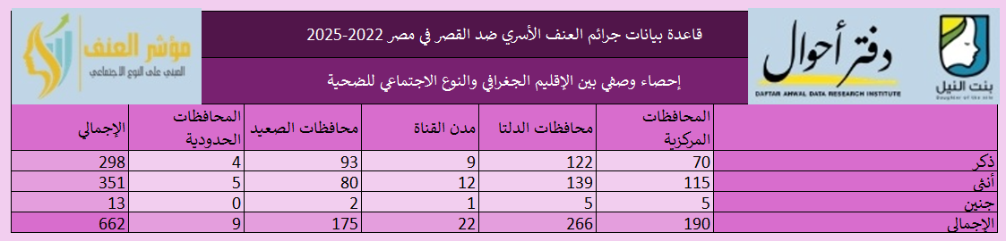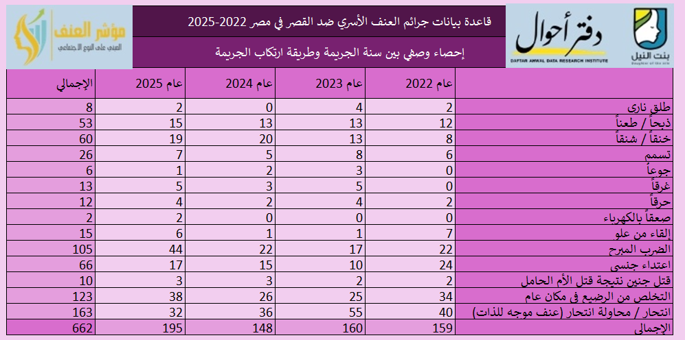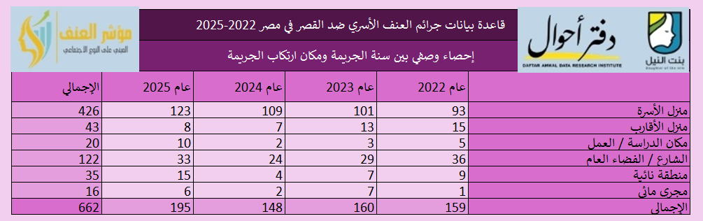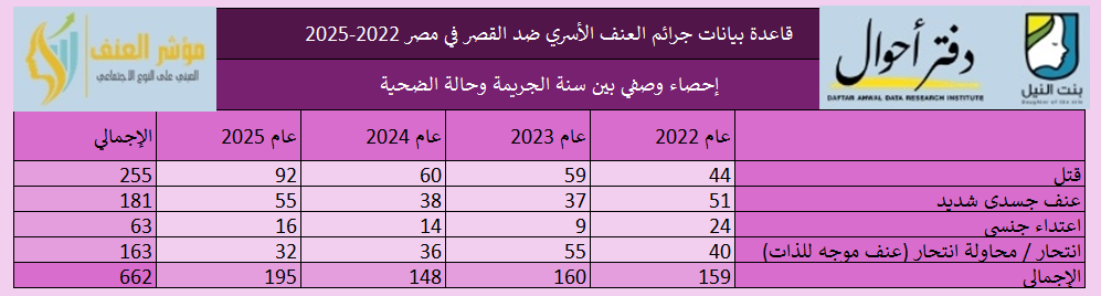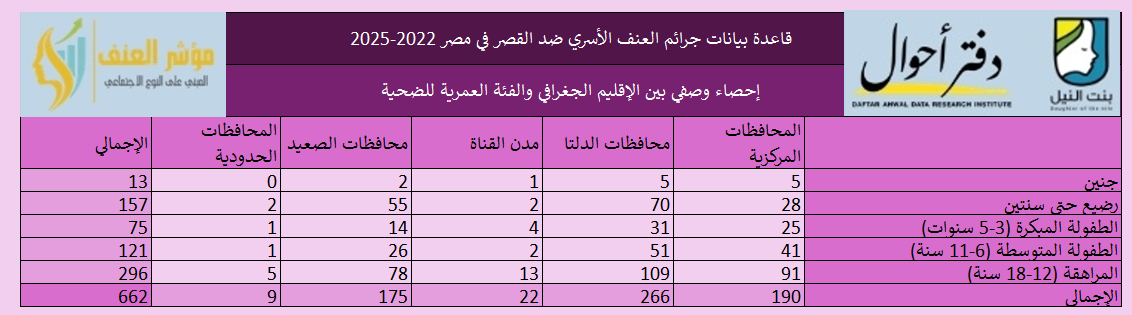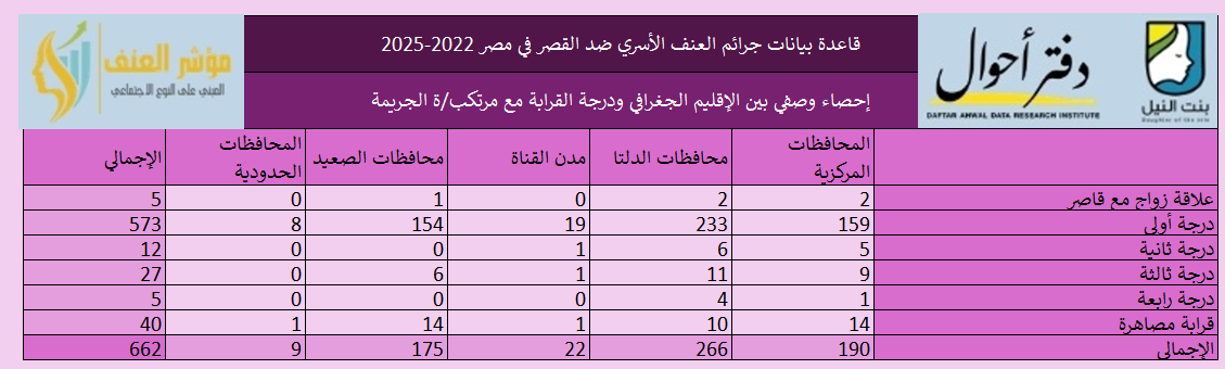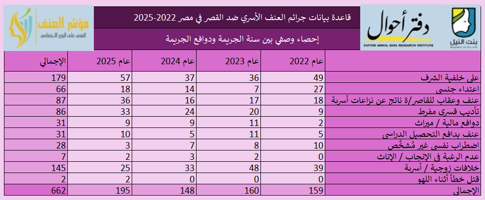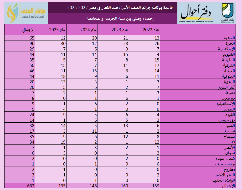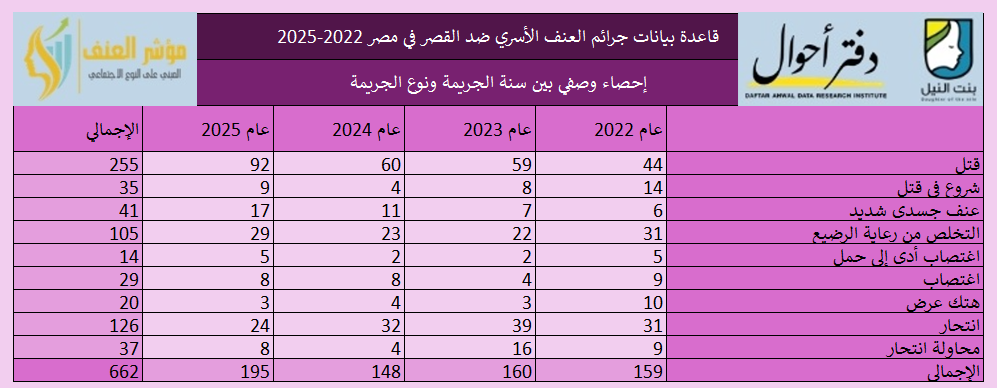 في إطار مؤشر "العنف المبني على النوع الاجتماعي"، من خلال شراكة استراتيجية بين معهد "دفتر أحوال لأبحاث البيانات" ومؤسسة "بنت النيل"، نطلق قاعدة بيانات تفصيلية مفتوحة حول "جرائم العنف الأسري ضد القصر في مصر خلال أربعة أعوام كاملة 2022-2025".