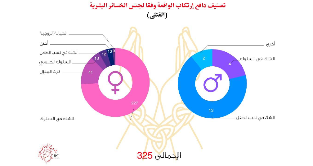 أوضح التقرير مسارًا عن أعداد الخسائر البشرية من قتلى ومصابين على خلفية ارتكاب جرائم بدعوى الشرف خلال الأعوام من 2015 إلى 2019 وفقًا لدافع ارتكاب الواقعة حيث بلغ إجمالي القتلى 325 قتيلًا (19 ذكور، 306 إناث) وكان “الشك في السلوك” الدافع الذي حصد العدد الأكبر من القتلى بإجمالي 231 قتيلًا (4 ذكور، 227 إناث)، يليها دافع “ترك المنزل” بإجمالي 41 حالة (جميعًا من الإناث)، في حين حصد “الشك في نسب الطفل” العدد الأكبر من القتلى الذكور (13 من الذكور و 12 إناث بإجمالي 25 قتيلًا).
