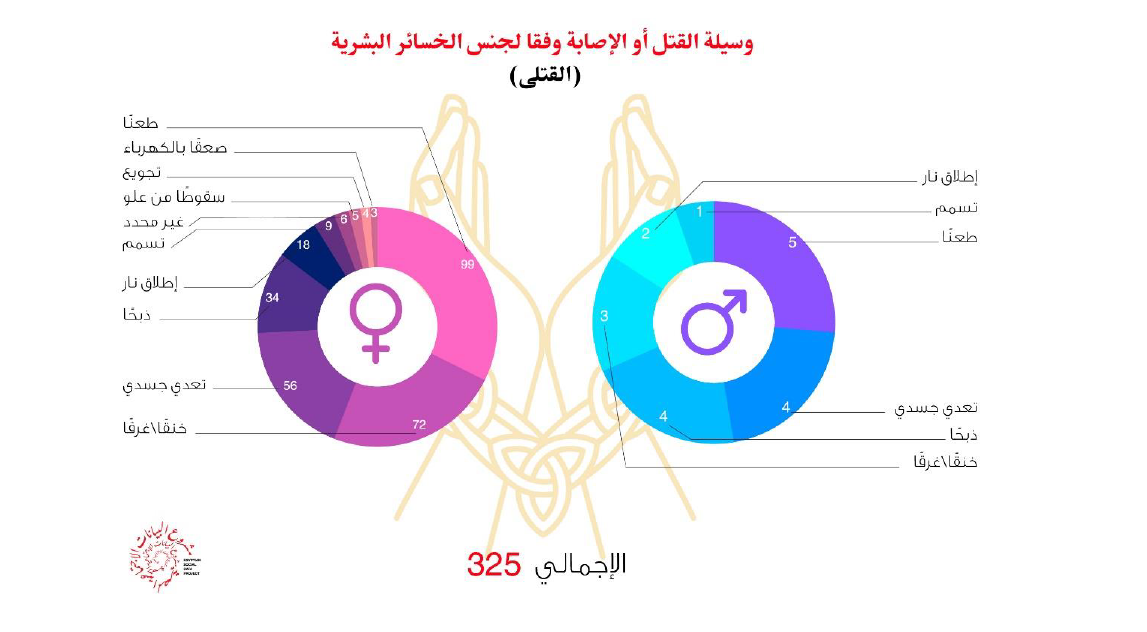 أبان المرصد تصنيف وسيلة القتل أو الإصابة، حيث كانت الوسيلة الأكثر استخدامًا للقتل هي الطعن بإجمالي 104 حالة (5 ذكور، 99 إناث) يليه الخنق بإجمالي 75 حالة(3 ذكور، و 72 إناث). وكان السبب الأكثر شيوعًا للإصابة أيضا الطعن حيث حصد 19 حالة (كلهم من الإناث)، يليه التعدي الجسدي بإجمالي 12 وقائع كلهم من الإناث.