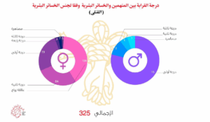 أوضح تصنيف درجات القرابة بين المتهمين بارتكاب الواقعة والمتضررين أن عدد القتلى الذين تربطهم “علاقة زواج” بالمتهمين كان الأكثر حصادًا للقتلى بإجمالي 126 حالة (كلهم من الإناث)، يليها عدد القتلى الذين تربطهم صلة قرابة من الدرجة الأولى بإجمالي 94 حالة (15 ذكور، 79 إناث).
