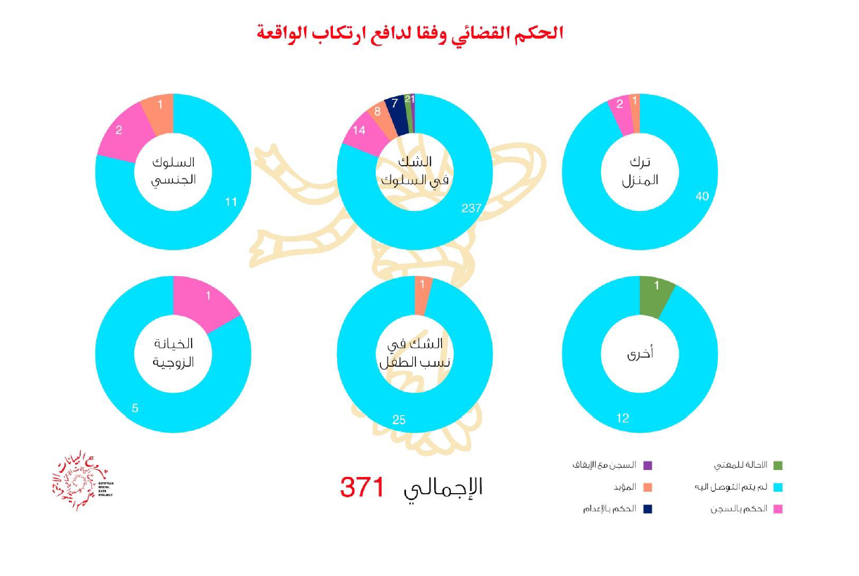 أما عن الأحكام القضائية، فهناك 3 حالات اتخذ فيها قرار الإحالة للمفتي (حالتين كان الدافع فيها الشك في السلوك)، و7 حالات تم الحكم فيها بالإعدام (كان الدافع الشك في السلوك)، و19 حالة تم الحكم فيها بالسجن (14 حالة الدافع فيها الشك في السلوك، ثم السلوك الجنسي وترك المنزل بإجمالي حالتين لكل منهما على حدة)، وكان الحكم “بالسجن المؤبد” للمتهمين في 11 حالة (بدافع الشك في السلوك في 8 حالات)، في حين حُكِم على متهم بارتكاب حالة قتل واحدة (بدافع الشك في السلوك) بالسجن مع إيقاف التنفيذ. ولم يتم التوصل للأحكام القضائية في 330 حالة.