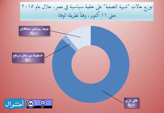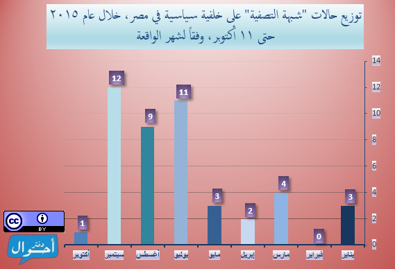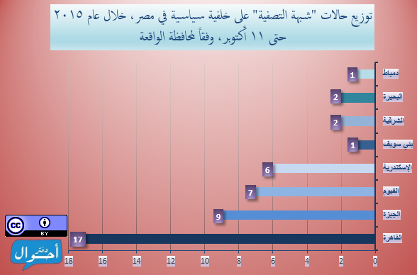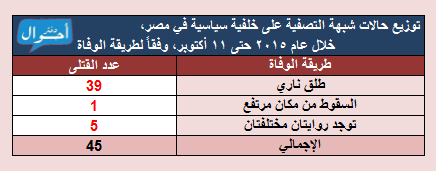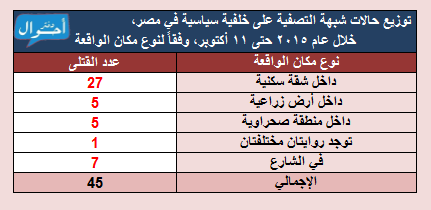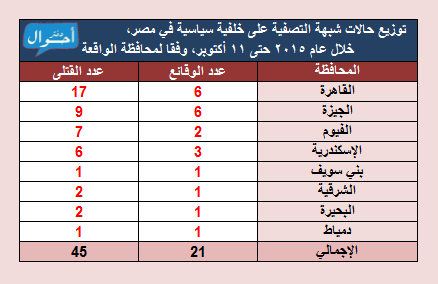 شهد عام 2015، في الفترة من 1 يناير حتى 11 أكتوبر، 21 واقعة “شبهة تصفية”، في تقرير أصدره “دفتر أحوال” بعنوان “حالات شبهة التصفية على خلفية سياسية في مصر” في الثالث عشر من أكتوبر من نفس العام، وتم تسجيل وأرشفة تلك الحالات خارج شبه جزيرة سيناء، قامت بها قوات الأمن ضد 45 مواطناً، موزعين على 8 محافظات مختلفة وهي؛ القاهرة، الجيزة، الفيوم، الإسكندرية، بني سويف، الشرقية، البحيرة، ودمياط.