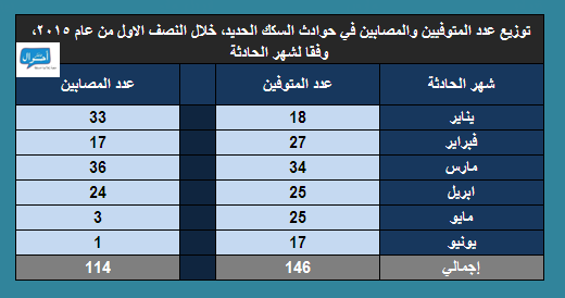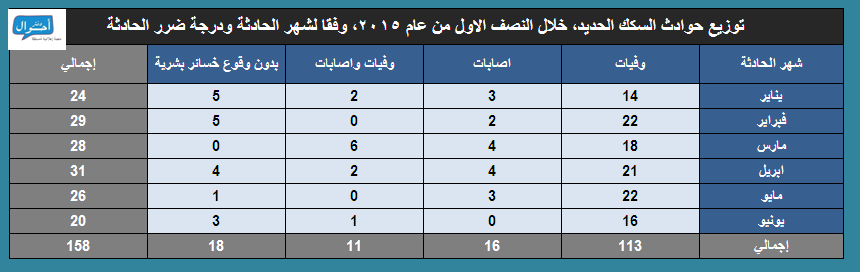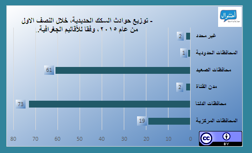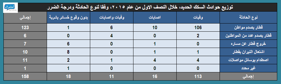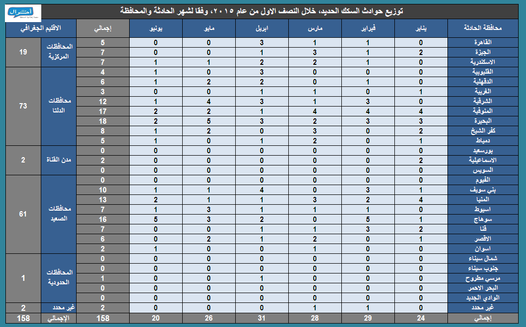 خلال النصف الأول من عام 2015، في الفترة من (1 يناير حتى 30 يونيو 2015)، تم رصد وأرشفة 158 حادثة منفصلة عبر السكك الحديدية في مصر، كان ضحيتها 146 حالة وفاة، و114 مصاب، موزعين عبر 20 محافظة ، ووفقا للتوزيع الجغرافي المتبع في التقرير، فقد سجلت محافظات الصعيد أعلى عدد من الوقائع (61 واقعة).