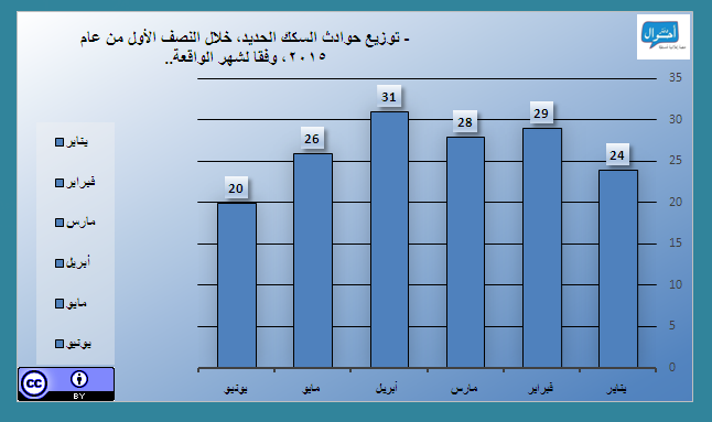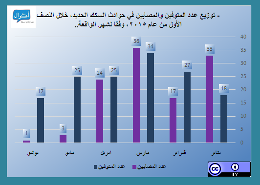 وفيما يلي الرسوم البيانية، وهي عبارة عن عروض بصرية تم تقسيمها إلى عدد الحوادث وفقا للإقليم الجغرافي، شهر الواقعة، عدد المتوفين والمصابين، ومقارنة أعداد المتوفين والمصابين.