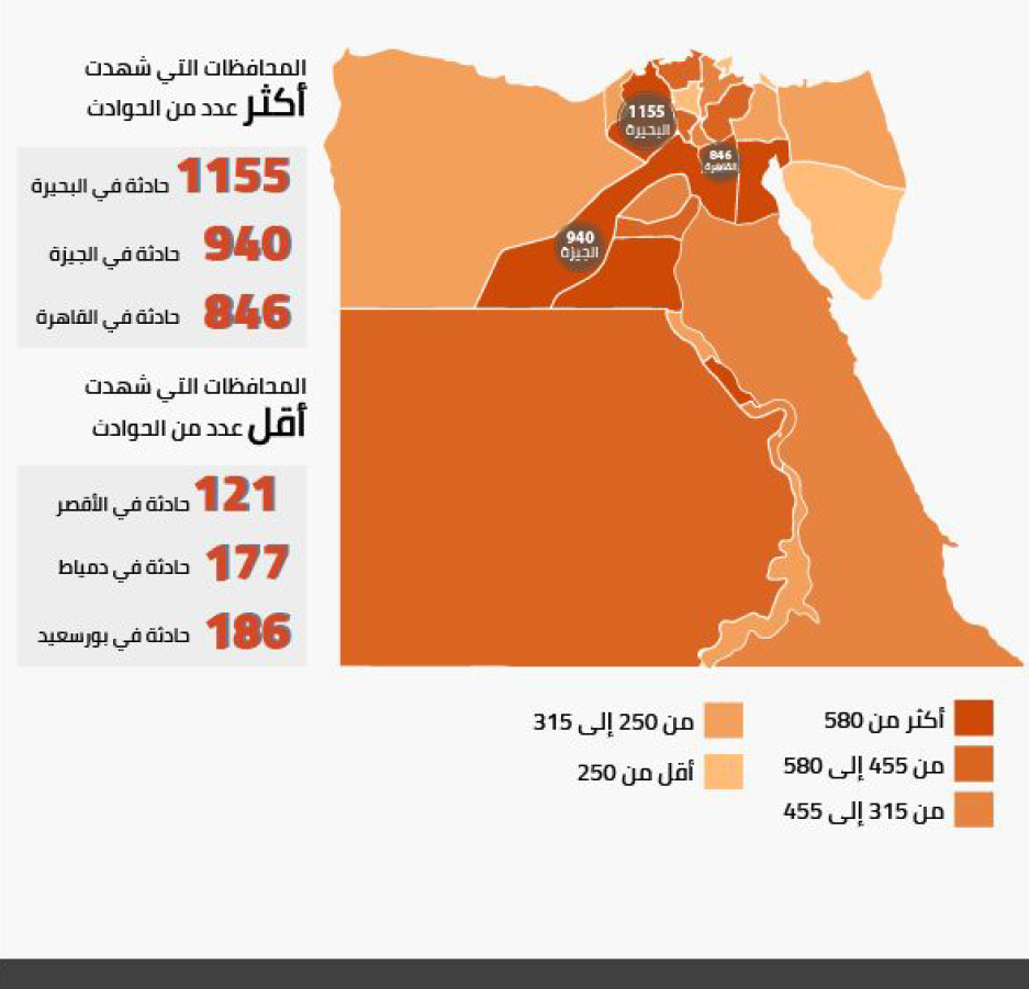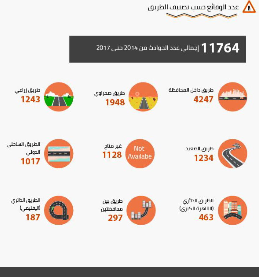 وفقاً لتصنيف الطريق، بلغ العدد الأكبر للوقائع على طرق داخل المحافظة بإجمالي 4247 واقعة، يليها الطريق الصحراوي الذي بلغت حوادث الطرق عليه 1948 واقعة، ثم الطريق الزراعي 1243 واقعة، بينما طريق الصعيد 1234 واقعة، والطريق الساحلي الدولي 1017 واقعة.