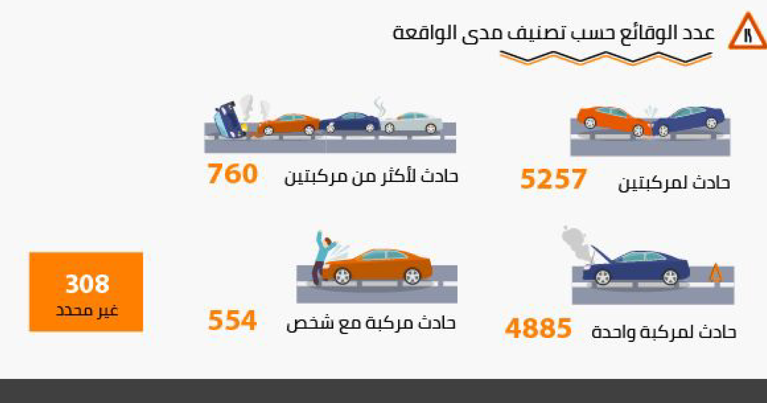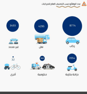 أما من حيث عدد الوقائع حسب مدى الواقعة والتصنيف العام للمركبات، حصد تصنيف “حادث لمركبتين” العدد الأكبر لمركبات “الركاب” بعدد 4517 مركبة ركاب، و2578 مركبة نقل، و1576 للدرجات البخارية، بينما حصد تصنيف حادث لمركبة واحدة العدد الأكبر من “المركبات الحكومية بإجمالي 324 مركبة حكومية.