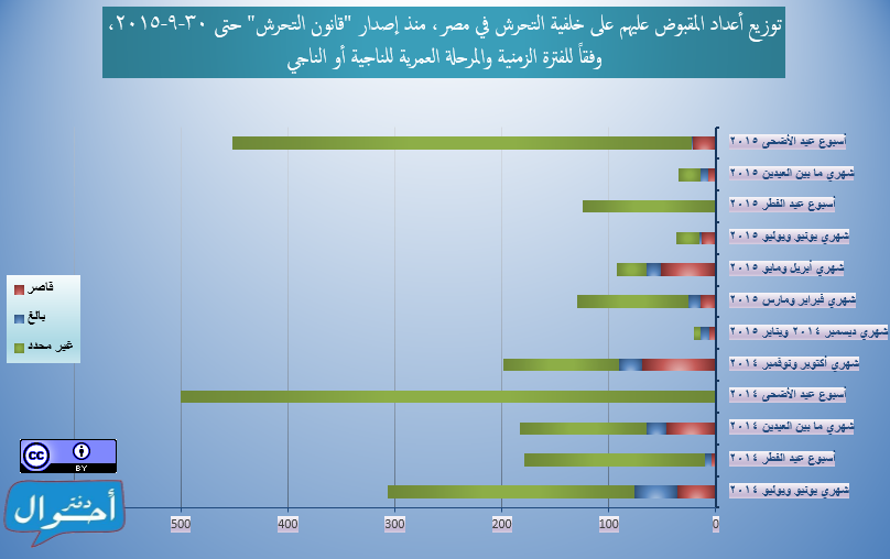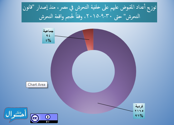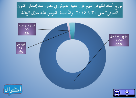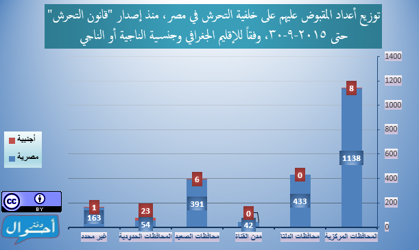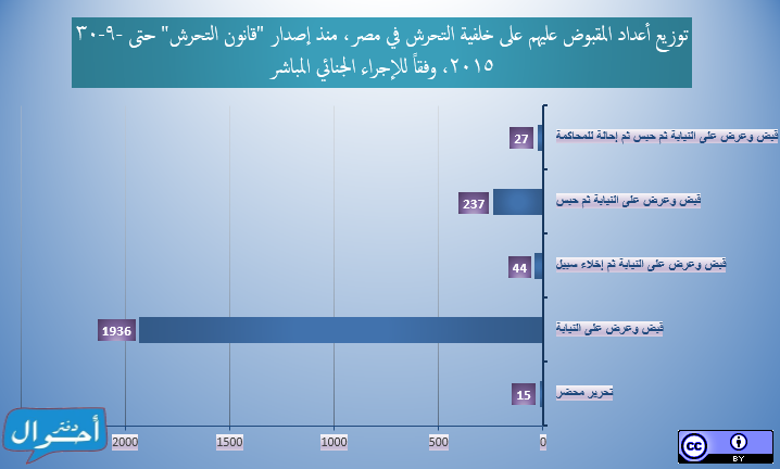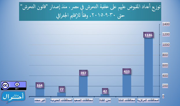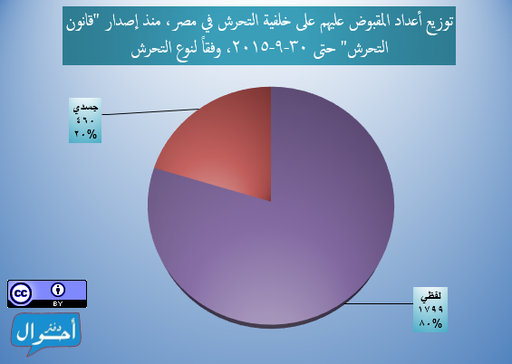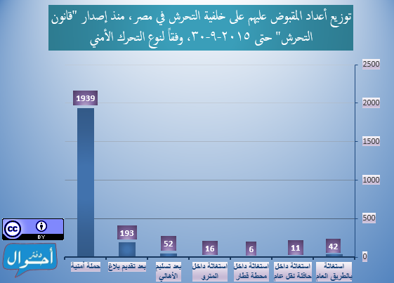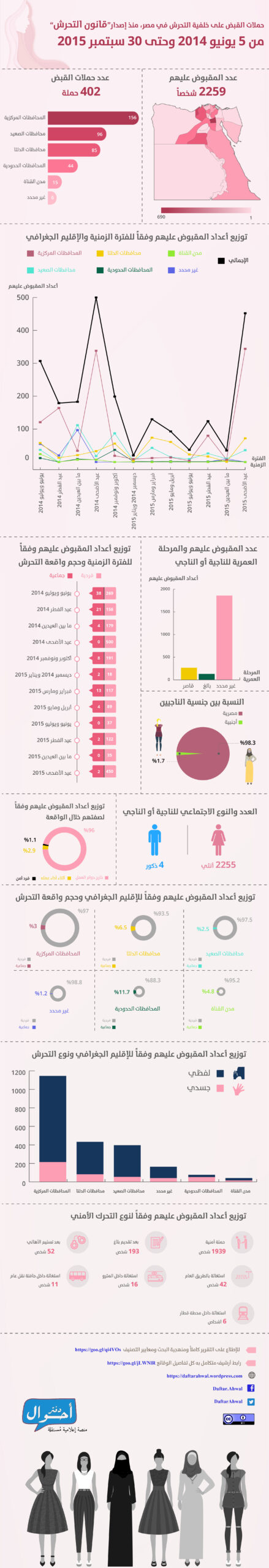 ومنذ إصدار “قانون التحرش” في 5 يونيو 2014 وحتى 30 سبتمبر 2015 (481 يوماً أي قرابة سنة وأربعة أشهر)، تم تسجيل وأرشفة 2259 شخصاً تم القبض عليهم في مصر في حوادث فردية أو جماعية على خلفية اتهامات تتعلق بالتحرش (ولا يمثل التقرير عدد المحبوسين خلال فترة زمنية معينة)، وذلك عبر 402 حملة أمنية منفصلة، موزعين عبر جميع محافظات الجمهورية و 133 دائرة قسم شرطة مختلفة، (بمعدل 4.7 شخص لكل يوم).