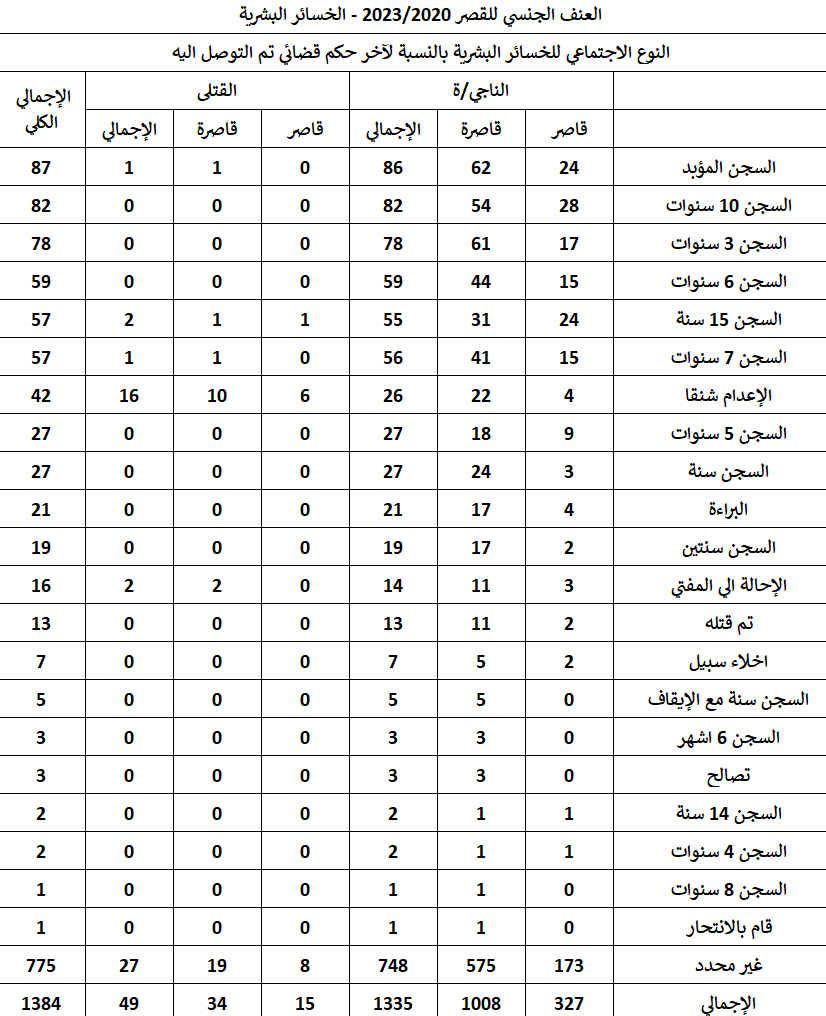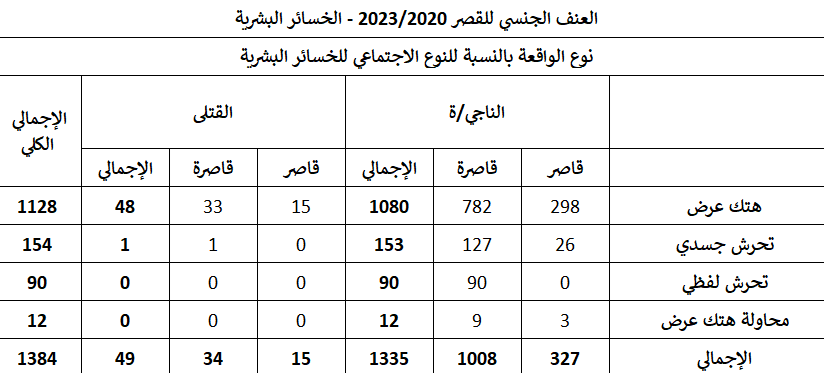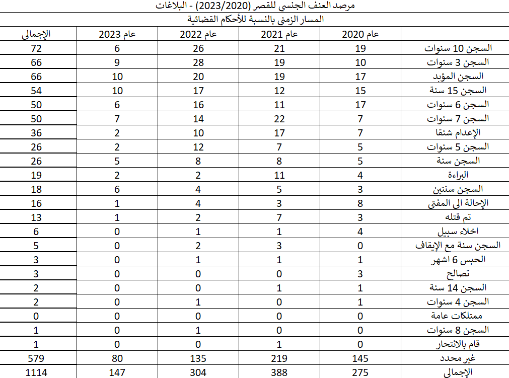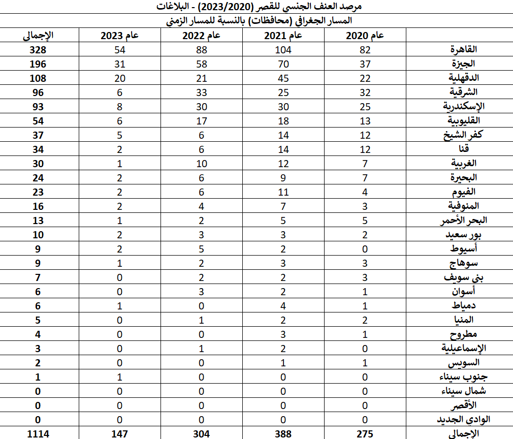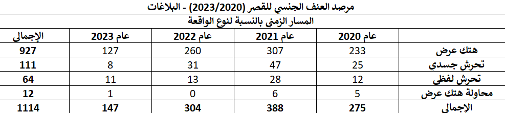 يهدف التقرير إلى رصد بلاغات التحرش وهتك العرض ومحاولات هتك العرض في مصر خلال فترة “خمس سنوات من 2020 حتى 2023” بناء على بلاغات أو شكاوى رسمية أو ضبط في حملات أمنية، بإجمالي 1114 واقعة و 1384 حالة تعرضت للتحرش أو هتك العرض/ محاولة هتك العرض و 1377 حالة تم اتهامها بارتكاب تلك الجريمة.